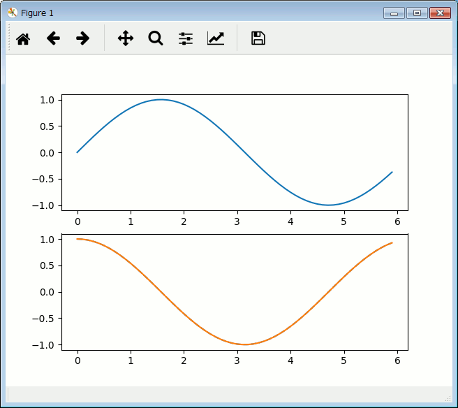 import numpy as np import matplotlib.pyplot as plt # pltを使うこと x = np.arange(0, 6, 0.1) plt.subplot(2, 1, 1) # 2行に分割, 1列に分割, 1何番目のプロットを指定) y = np.sin(x) plt.plot(x,y) # プロット用データを設定 plt.subplot(2, 1, 2) # 2行に分割, 1列に分割, 2何番目のプロットを指定) y = np.cos(x) plt.plot(x,y, linestyle="--", label="cos") plt.plot(x,y) # プロット用データを設定 plt.show() #表示されると、plt内容はクリア