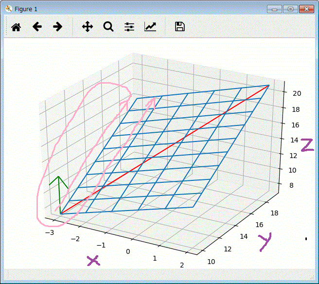 def plot_xyz_to_xyz(x1,y1,z1, x2,y2,z3 , color="red"): X = np.array( [ [x1, x2] ]) Y = np.array( [ [y1, y2] ]) Z = np.array( [ [z1, z2] ]) ax.plot_wireframe(X,Y,Z, color=color) #ワイヤーフレームのプロット x1,y1,z1, x2,y2,z2 = (-3, 10 , 7, 2, 19, 21) plot_xyz_to_xyz( x1,y1,z1, x2,y2,z2 ) # 線をプロットする。 # 矢印をプロットする。 px, py, pz = ( np.array([[-3]]), np.array([[10]]), np.array([[ 7]]) ) u, v, w = ( np.array([[ 0 ]]), np.array([[ 0 ]]), np.array([[ 1 ]]) ) ax.quiver(px, py, pz, u, v, w, length=5, normalize=True, color="green") # 矢印プロット plt.show() #表示