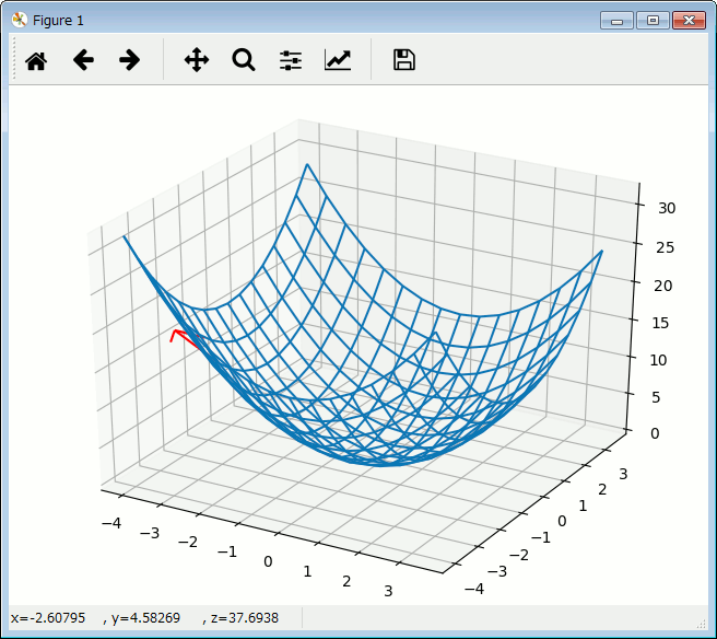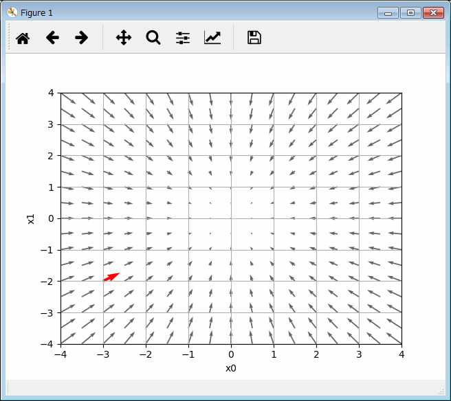 x=np.array([ -3.0, -2.0 ]) # x0=-3.0, x1=-2.0 の勾配の(上記の赤の矢印と同じ)を、以下で2次元にプロットする。