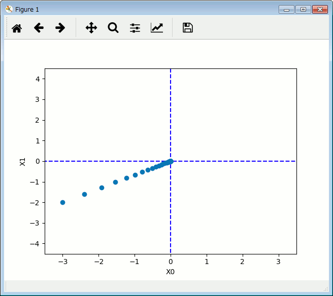 plt.plot( [-5, 5], [0,0], '--b') # 水平軸のプロット y=0