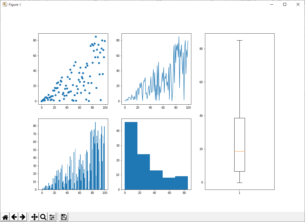 import numpy as np x2=np.arange(100) y2= x2 * np.random.rand(100) # 100個の乱数 import matplotlib.pyplot as plt plt.figure(dpi=70, figsize=(15,10))#描画サイズ plt.subplot(2,3,1) plt.scatter(x2,y2) #散布図(分布図)、点でプロットしたもの。 plt.subplot(2,3,2) plt.plot(x2,y2) #折れ線グラフでプロットしたもの。 plt.subplot(2,3,4) plt.bar(x2,y2) #棒グラフでプロットしたもの。 plt.subplot(2,3,5) plt.hist(y2, bins=5) #ヒストグラムでプロットしたもの。 plt.subplot(1,3,3) plt.boxplot(y2) #箱ひげ図表示 plt.show()
