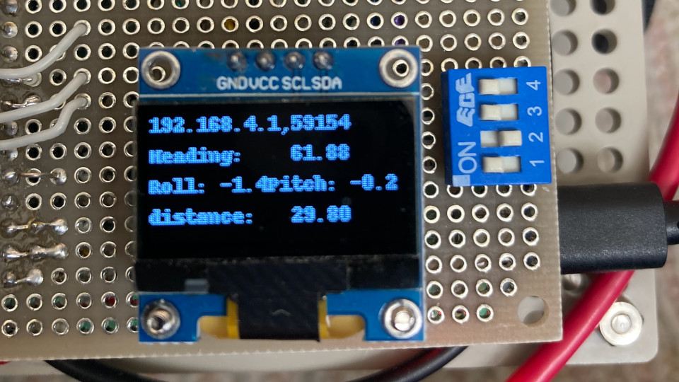 以下のコードは、以前に作成したファイルなどのTCPサーバーに、 リアルタイムの方位角度(heading:0〜360度)、左右の傾き(roll:-180〜180度)、上下の傾き(pitch:-180〜180度)、 前方障害物との距離(disitance:10cm〜400cm)をSSD1306ディスプレイに0.1秒周期で表示するプログラムです。